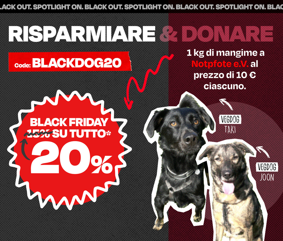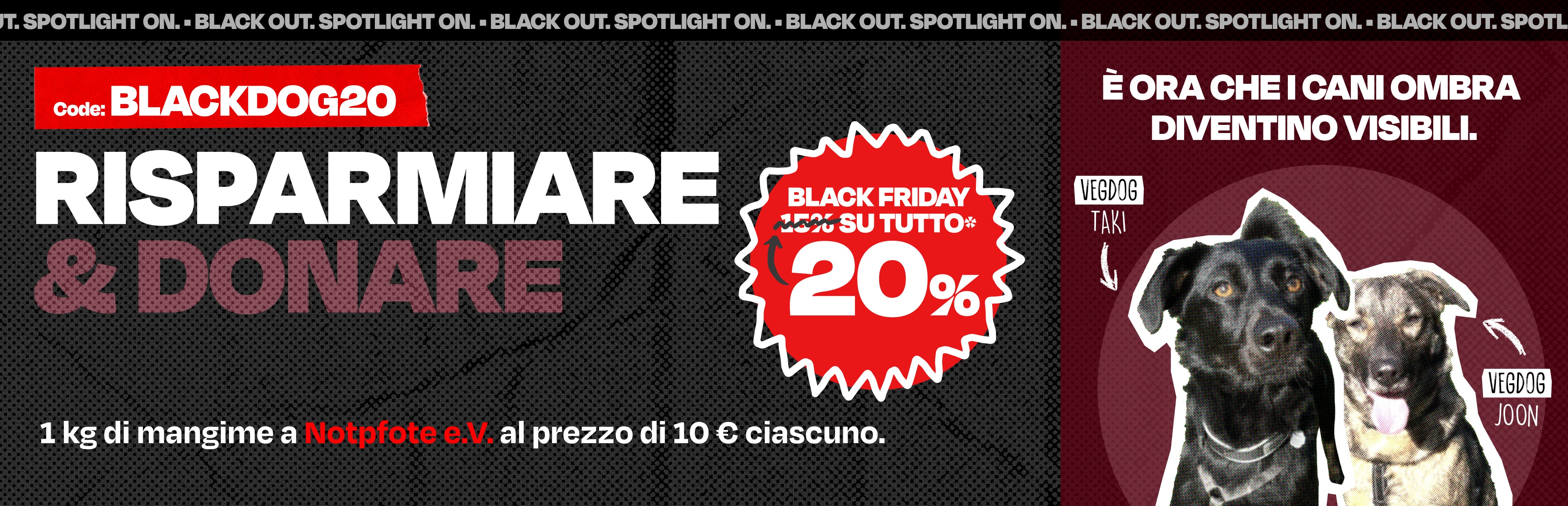 * Nota sullo sconto del 20% per il Black Friday: 20% su tutto l'assortimento fino ad esaurimento scorte, esclusi Mobilities e abbonamenti, utilizzabile una sola volta. Per ogni 10 € di acquisto netto (dal nostro intero assortimento di alimenti), VEGDOG donerà 1 kg di cibo all'associazione Notpfote e.V. Periodo della promozione: dal 28/11 al 01/12.