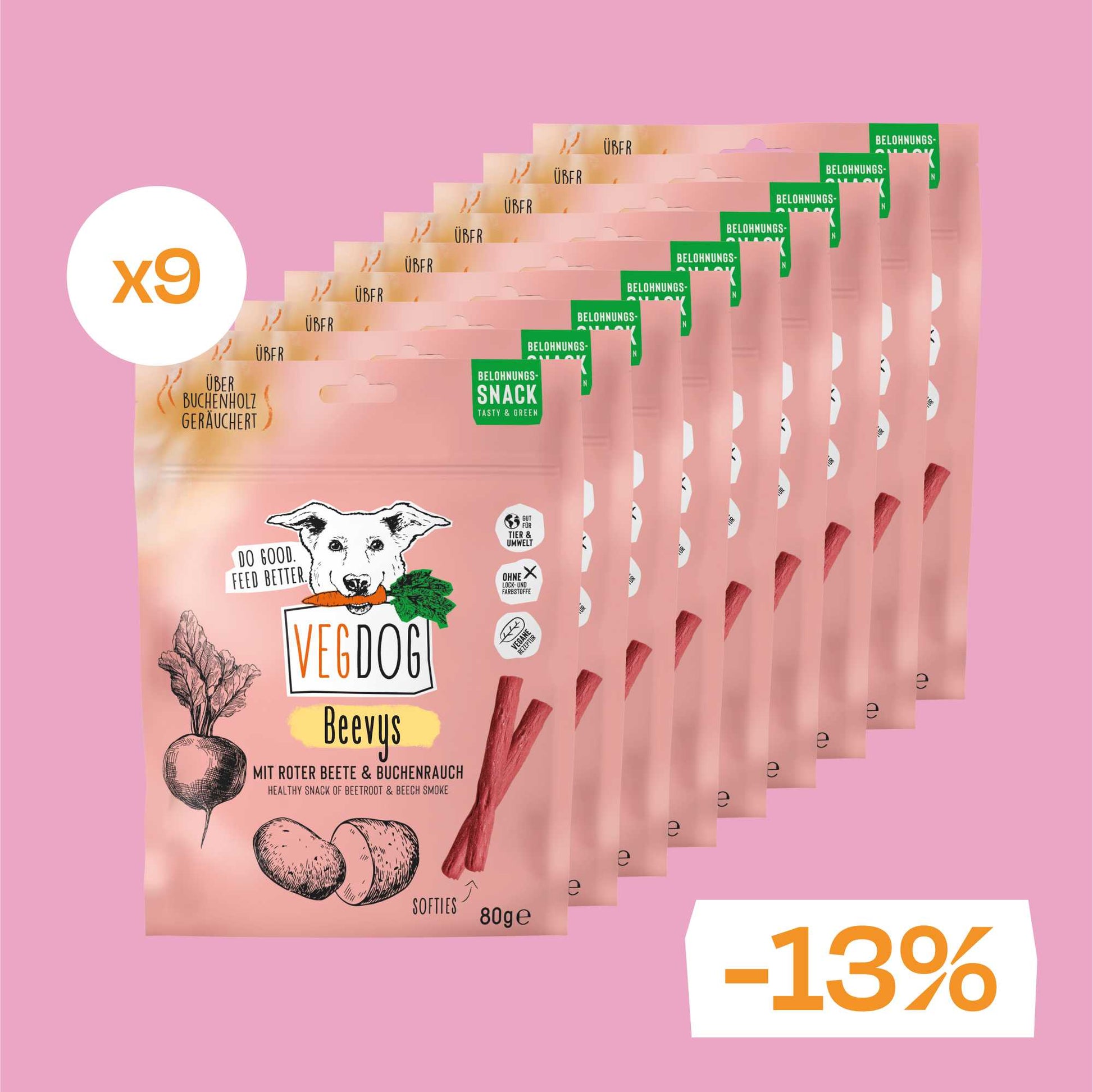 Die BEEVYS sind nicht nur frei von ungesunden Zusätzen wie Lock- und Farbstoffen, sondern strotzen auch vor natürlichem Buchenrauch-Aroma und der Powerwurzel Rote Bete: Vitamin C, Eisen, Magnesium, Kalium, Kalzium und B-Vitamine inklusive. Da ist kein Quatsch dabei – down to earth, wie diese Rübe selbst. Dank der hypoallergenen Rezeptur sind die VEGDOG BEEVYS auch für Futtermittelallergiker geeignet.