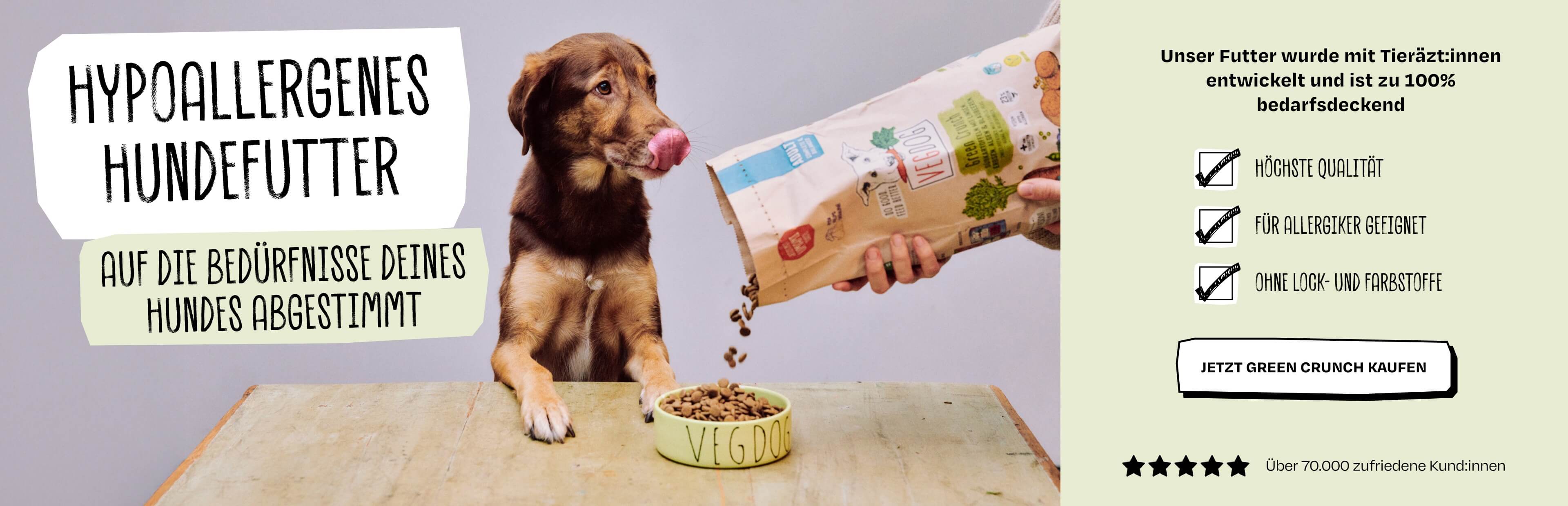Die Umstellung sollte behutsam über einen Zeitraum von drei Wochen erfolgen. Steigere nach und nach die Futtermenge von VEGDOG und reduziere die Menge des bisher gefütterten Futters. Wiege deinen Hund in regelmäßigen Abständen und beobachte den Allgemeinzustand.
